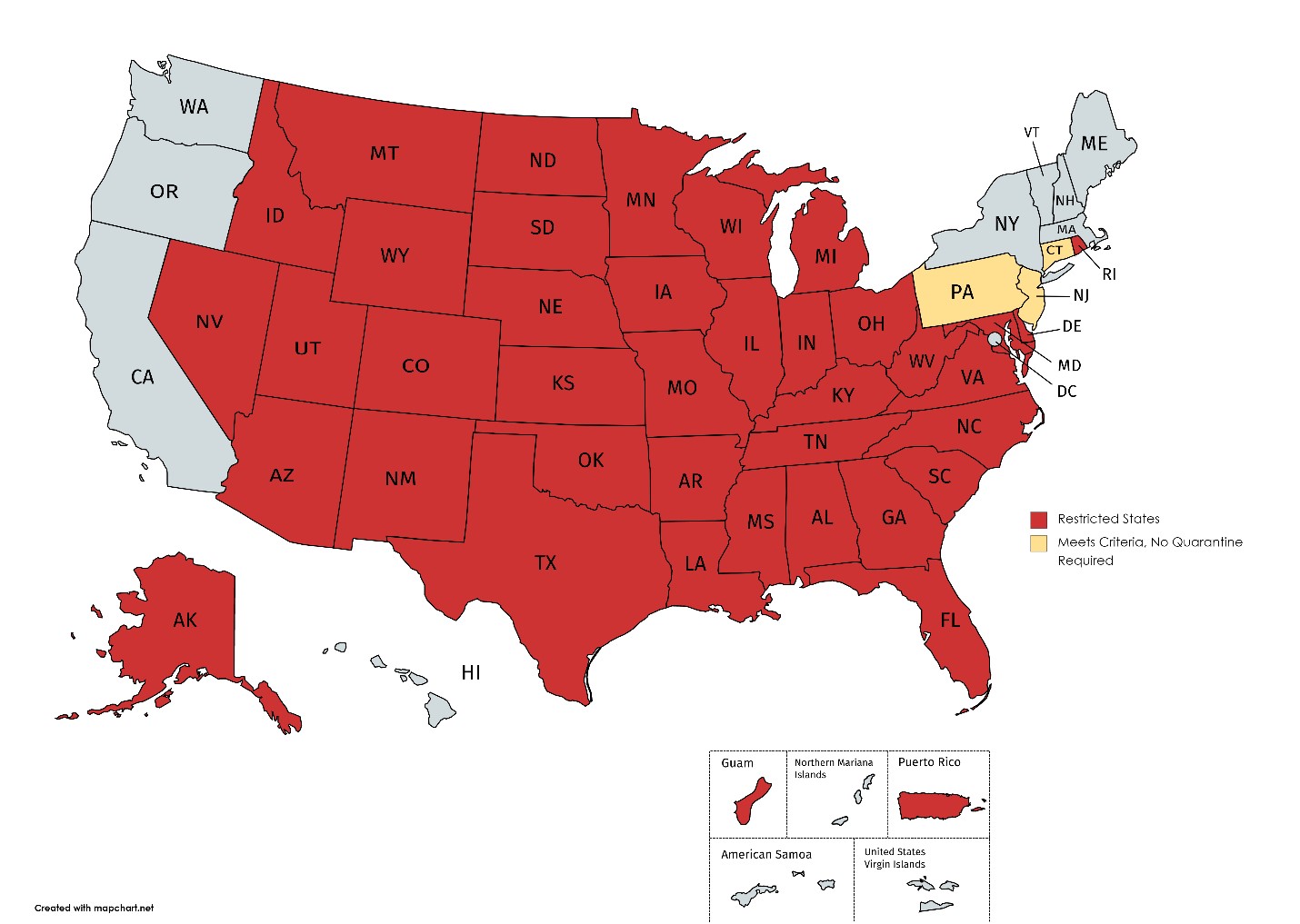 A state qualifies for a travel restriction if it has either (1) a new daily positive test rate higher than 10 per 100,000 residents over a seven-day rolling average, or (2) higher than 10% positivity rate over a seven-day rolling average. According to the Guidance, New York will announce the impacted states on a weekly basis.