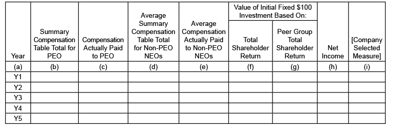 The final rules, which apply to registrants other than emerging growth companies, registered investment companies and foreign private issuers, include three new disclosure requirements. First, the final rules require a table that reports for each of the last five fiscal years[1] (i) the compensation of the company’s principal executive officer (PEO) and the average compensation of the company’s other named executive officers (NEOs), both as reported in the Summary Compensation Table and as actually paid, and (ii) certain financial performance measures. The table should look substantially like the following: