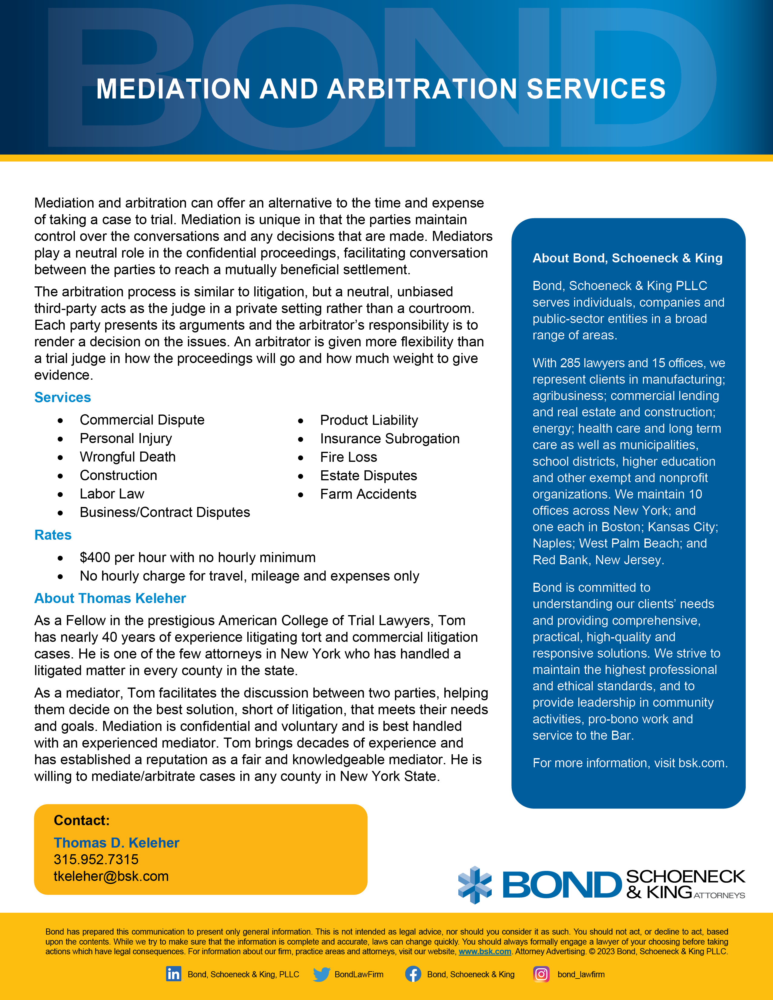 As a Fellow in the prestigious American College of Trial Lawyers, Tom has nearly 40 years of experience litigating tort and commercial litigation cases, including product liability, personal injury, property damage, premises liability, Labor Law 240, motor vehicle accidents, toxic tort, construction, business, and trust and estate litigation. He routinely represents corporations, small businesses, construction companies, individuals, insurance companies, third-party administrators, public entities and school districts.